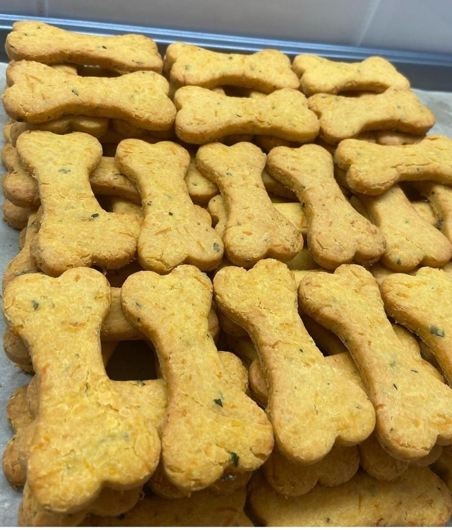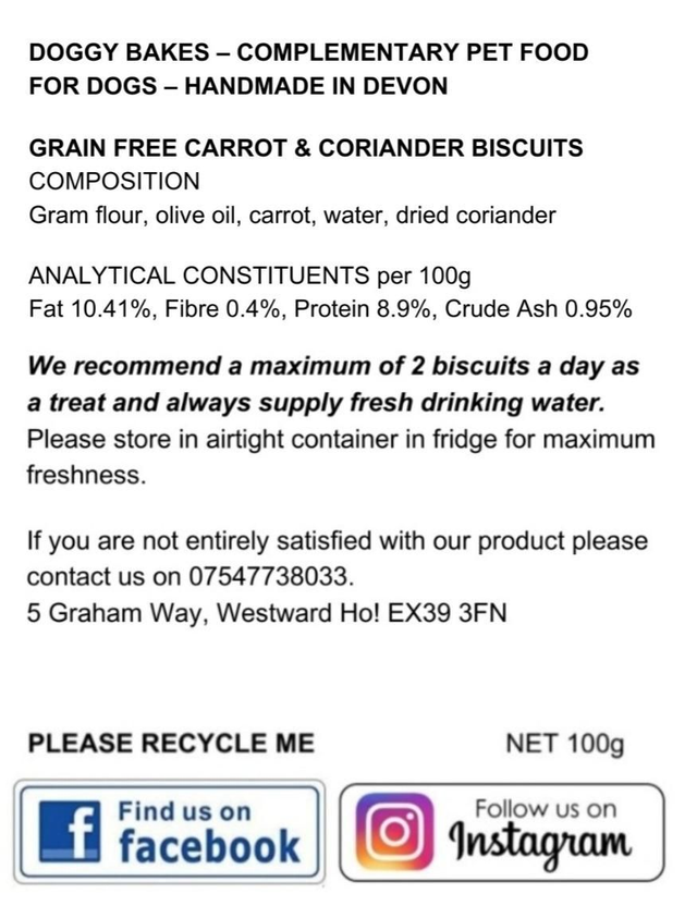 We use Gram Flour and lots of Carrot with a tiny pinch of Coriander. These are mixed with Olive oil and a small amount of water. These treats have a big following for those dogs with sensitive tums or allergies.