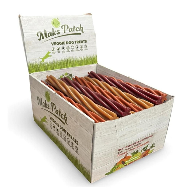 The Maks'Patch Jumbo Twist Sticks contain natural vegan ingredients with 3 flavour combinations, Peanut Butter which dogs love, a Smokey BBQ Facon flavour, and not least Pumpkin Carrot & Paprika which smells soooo good. (Think Campbell's tomato soup)